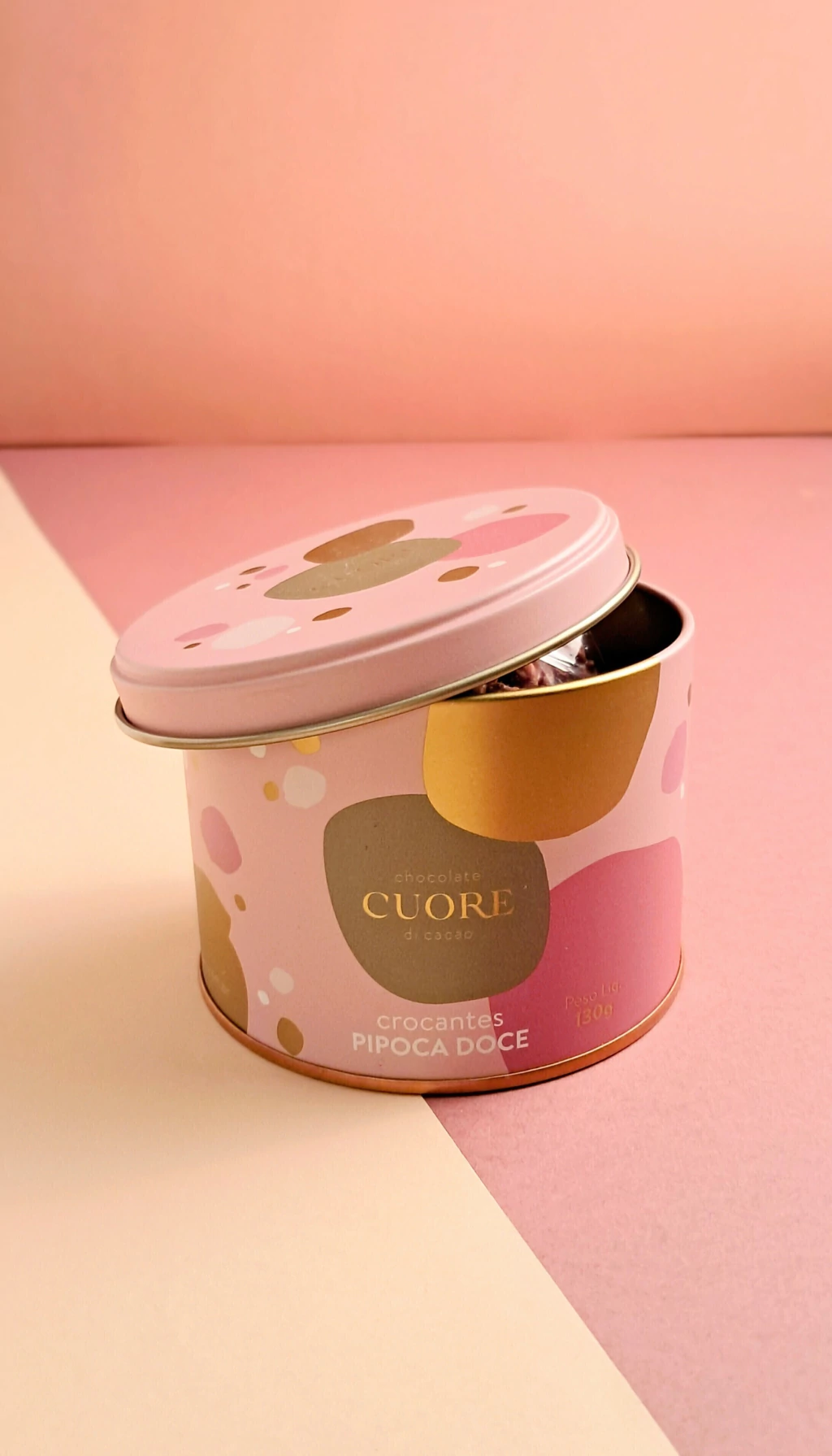 Lata com crocantes de chocolate ao leite, pedacinhos de milho torrado e um leve toque de flor de sal, a combinação resulta em um chocolate extremamente crocante e com sabor de pipoca caramelizada. Incrível!